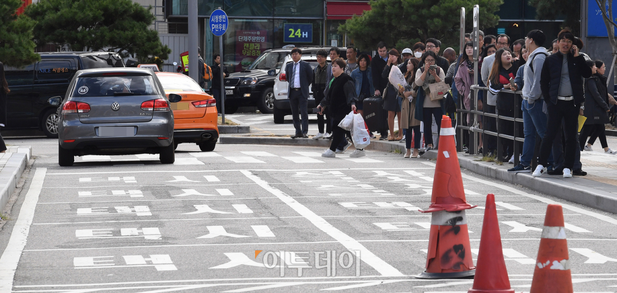 '카카오 카풀 서비스'에 반발한 택시업계가 24시간 운행 중단에 돌입한 18일 오후 평소 같으면 택시가 줄지어 승객을 기다렸을 서울역 앞 택시 승차장에서 승객들이 오매불망 택시를 기다리고 있다. 오승현 기자 story@