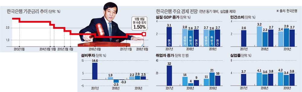 다만 한은은 여전히 잠재성장률 수준에 부합한다고 밝혔다. 결국 한은이 그간 밝힌 잠재성장률 수준 2.8%에서 2.9%가 하향조정됐음을 시사한 셈이다. 실제 이주열 한은 총재는 이날 금융통화위원회 기준금리 결정 직후 가진 기자회견에서 “(2.7%는) 잠재성장률에 부합하는 수준”이라고 말했다.