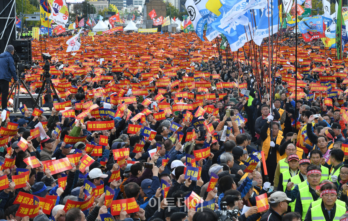'카카오 카풀 서비스'에 반발한 택시업계의 생존권 사수 결의대회가 열린 18일 오후 서울 세종로 광화문광장에서 택시업계 종사자들이 생존권 보호를 주장하며 대규모 집회를 벌이고 있다. 택시업계는 이날 새벽 4시부터 24시간 동안 택시 운행을 중단했다. 오승현 기자 story@