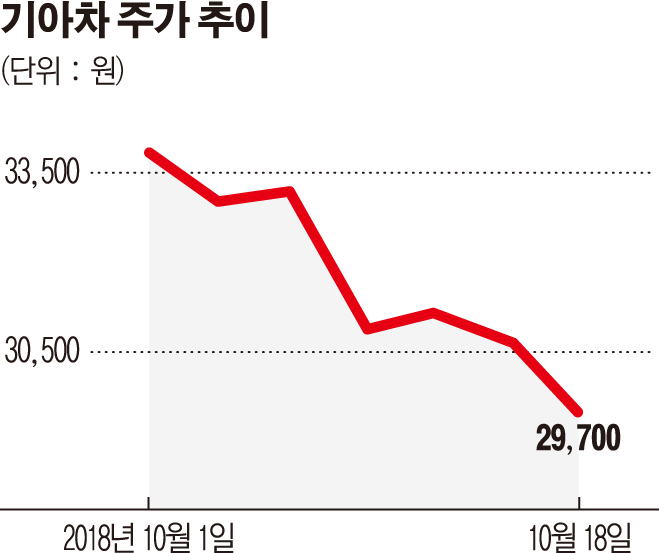 18일 기아차는 유가증권시장에서 전 거래일 대비 3.57%(1100원) 하락한 2만9700원에 장을 마감했다. 기아차가 마감가 기준으로 2만원 대를 터치한 것은 2010년 5월 이후 8년 만이며 장 중 기준으로는 지난 7월 이후 3개월 만이다.