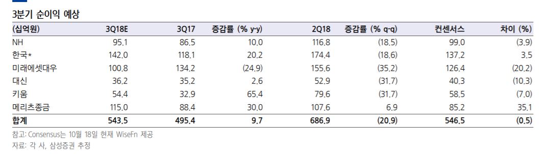 19일 삼성증권은 미래에셋대우, 한국금융지주, NH투자증권, 키움증권, 메리츠종금증권, 대신증권 등 증권사 6곳의 3분기 합산 순이익이 5435억 원을 기록할 것으로 전망했다. 이는 전분기 대비 20.9% 감소, 전년 대비 9.7% 증가한 수치다.