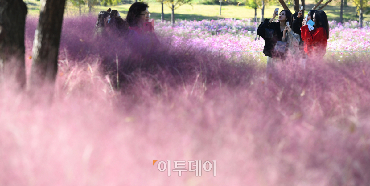 휴일인 21일 오전 전남 순천시 순천만 국가정원에서 나들이객들이 '핑크 뮬리 그라스'를 관람하며 깊어가는 가을을 만끽하고 있다. 오승현 기자 story@