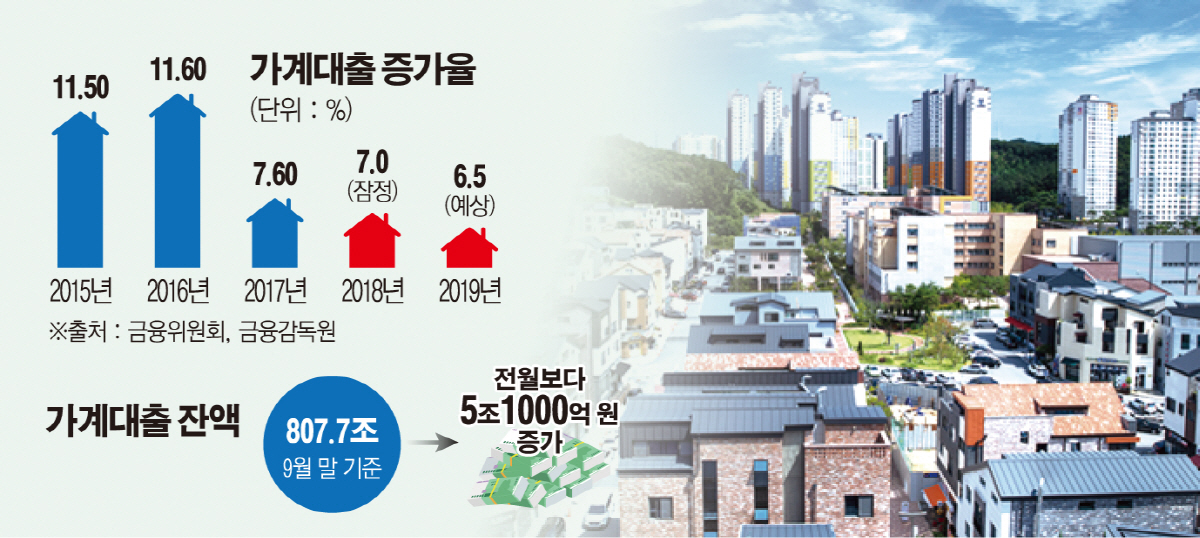 이처럼 금융당국의 국내 가계부채 문제를 해석하는 시각이 1년 사이 확 달라졌다. 현재 기준과 견주여 각종 대출규제를 옥죄면서 가계 빚 증가를 억누르겠다는 복안이다. 지난해 전 금융권 가계대출 증가율은 7.6%로 2016년(11.6%)보다 4%포인트 하락했다. 반면 가계대출 잔액은 올해 9월 기준으로 지난해 같은 기간보다 6.1% 늘었다. 당국은 부채의 증가 속도가 여전히 빠르다고 보고, 이를 ‘국부(國富)’의 성장 속도와 발을 맞추려는 의도로 보인다.
