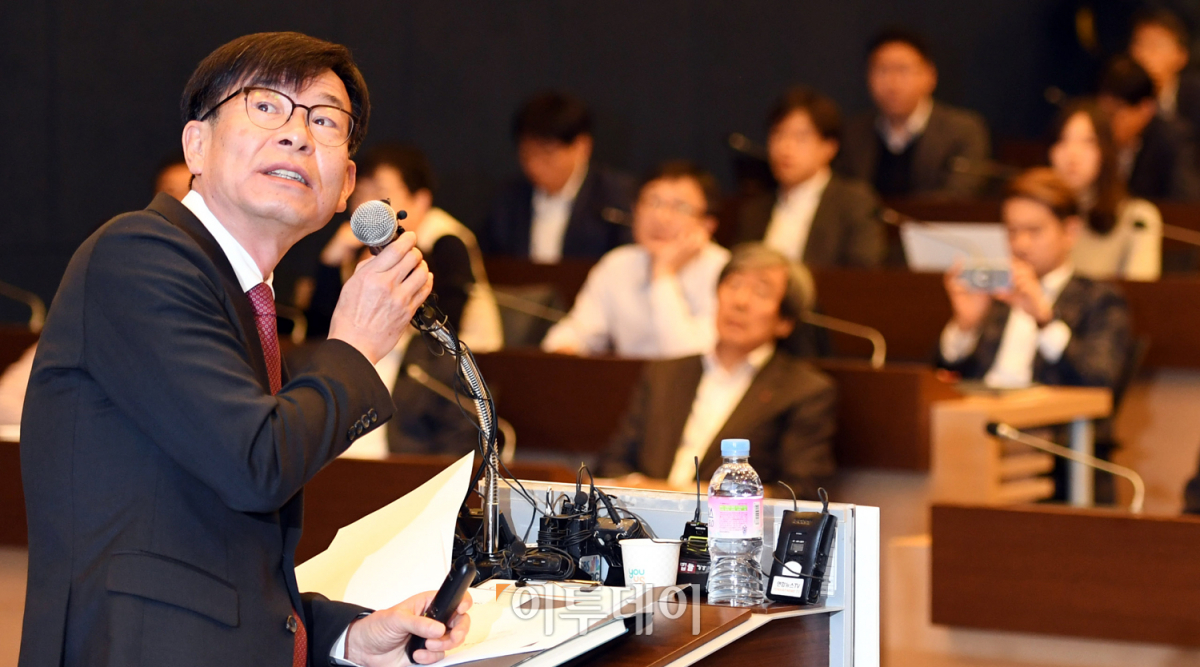 김상조 공정거래위원장이 22일 오전 서울 중구 대한상공회의소에서 열린 '공정거래정책 기업 간담회'에서 강연하고 있다. 이날 김 위원장은 기업인들을 대상으로 공정거래법 전부 개정안과 하도급법 개정 시행령 등 최근 변화된 정책을 강연했다. 오승현 기자 story@