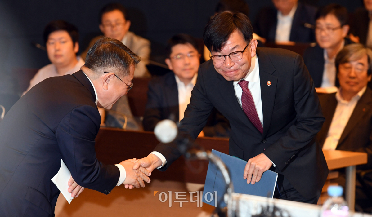 김상조(오른쪽) 공정거래위원장이 22일 오전 서울 중구 대한상공회의소에서 열린 '공정거래정책 기업 간담회'에서 김준동 대한상의 상근부회장과 악수하고 있다. 이날 김 위원장은 기업인들을 대상으로 공정거래법 전부 개정안과 하도급법 개정 시행령 등 최근 변화된 정책을 강연했다. 오승현 기자 story@