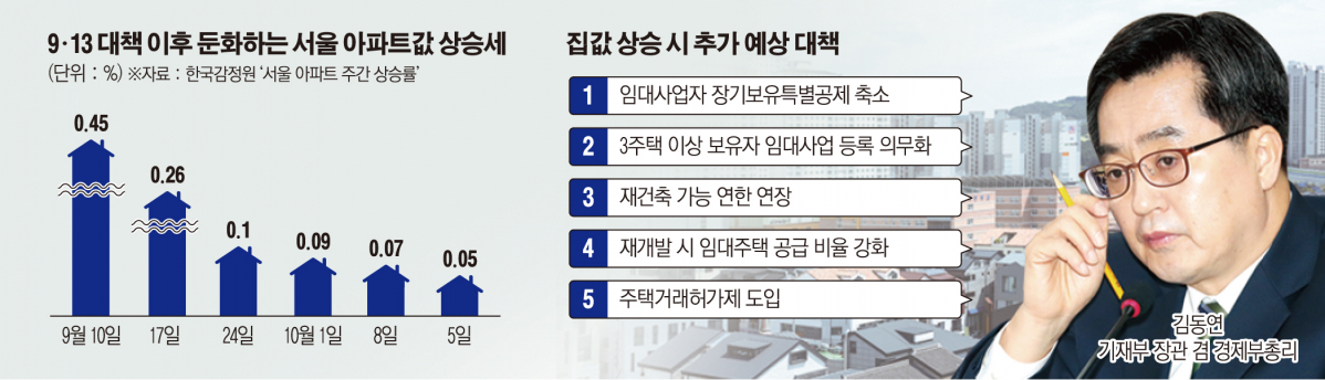 김 총리의 엄포는 향후 주택시장의 과열 가능성을 원천 차단하려는 신호로 읽힌다. 지난해 8·2 대책, 가계부채 대책, 임대등록 활성화방안 등이 발표됐을 때도 잠시 주춤하던 집값이 용수철처럼 튀어 오른 바 있다.