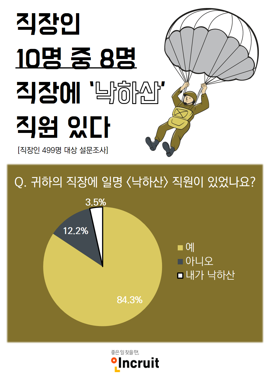 기업의 낙하산인사에 대한 잡음이 끊이지 않고 있다. 23일 취업포털 인크루트의 '낙하산 직원' 설문조사 결과, 직장인 10명 중 8명 이상이 ‘낙하산 직원’이 있다고 응답했다.
