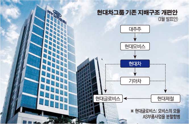 현대차그룹은 지난 3월 현대모비스를 인적분할하고, 모듈‧AS부품 사업 부문을 현대글로비스가 합병하는 내용의 지배구조 개편안을 발표했다. 분할합병 후 대주주와 계열사 간 지분 양수도를 통해 현대모비스-현대차-기아차-현대모비스로 이뤄진 순환출자 구조를 해소한다는 전략이었다.