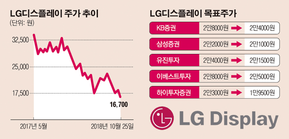 증권업계는 LG디스플레이가 내년 1분기 다시 영업적자로 돌아설 것으로 예상하고, 내년 초까지는 주가 회복이 쉽지 않을 것으로 전망하고 있다. 이 때문에 증권사들은 이달들어 LG디스플레이의 목표가를 △KB증권 2만8000원→2만4000원 △삼성증권 2만2000원→2만1000원 △유진투자 2만4000원→2만1500원 △이베스트투자 2만8000원→2만5000원 △하이투자증권 2만3000원→1만9500원 등으로 하향 조정했다.