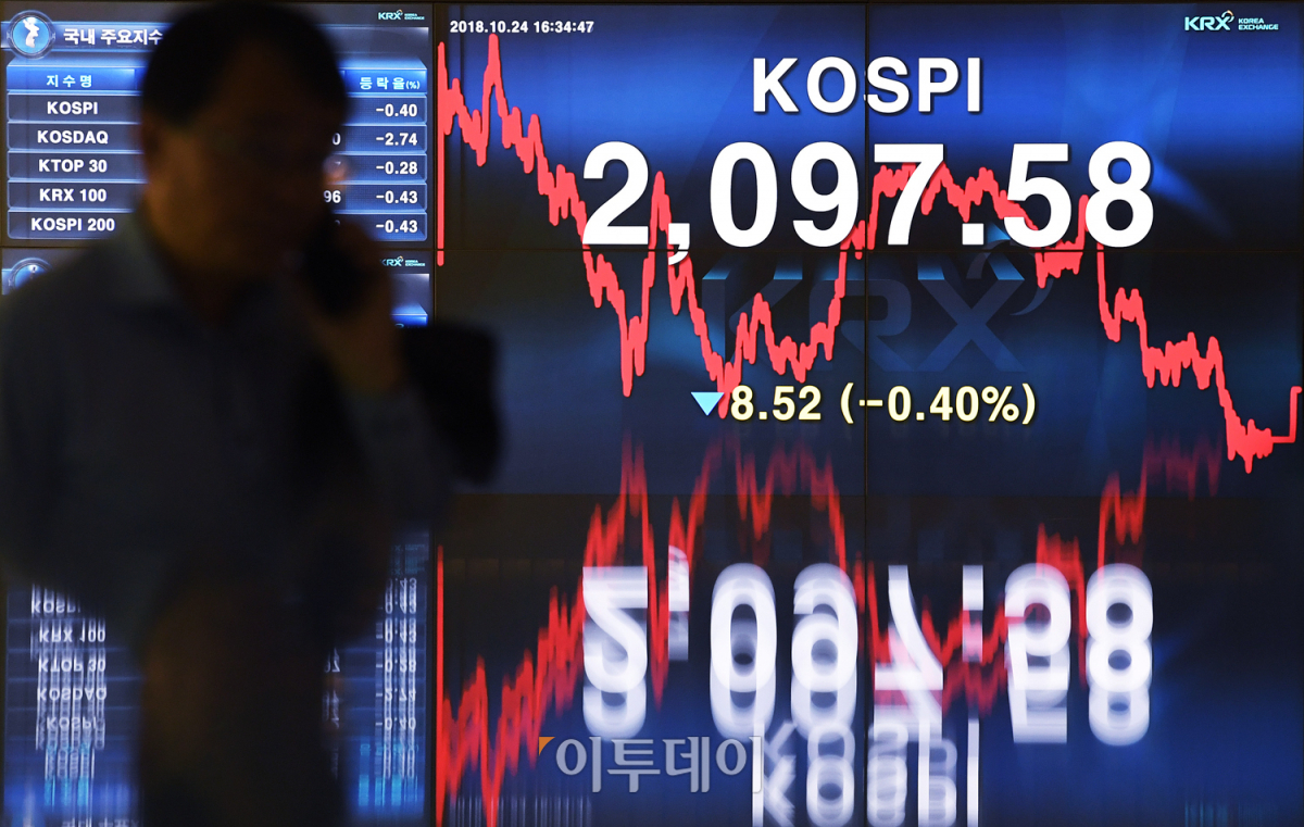 코스피(KOSPI) 지수가 24일 전날 기록한 연중 최저치(2094.69)를 하루 만에 경신하는 등 외국인 매도 공세에 추락하고 있다. 코스닥(KOSDAQ) 지수 또한 1년 만에 700선이 무너졌다. 서울 여의도 한국거래소 전광판에 전 거래일보다 8.52포인트(0.40%) 내린 이 날 코스피 종가 2097.58이 나타나고 있다. 오승현 기자 story@