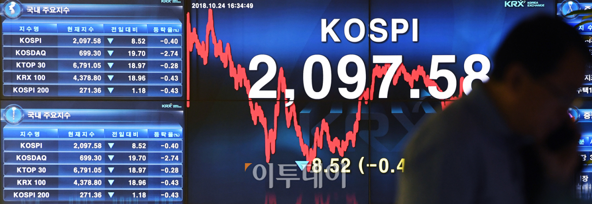 코스피(KOSPI) 지수가 24일 전날 기록한 연중 최저치(2094.69)를 하루 만에 경신하는 등 외국인 매도 공세에 추락하고 있다. 코스닥(KOSDAQ) 지수 또한 1년 만에 700선이 무너졌다. 서울 여의도 한국거래소 전광판에 전 거래일보다 8.52포인트(0.40%) 내린 이 날 코스피 종가 2097.58이 나타나고 있다. 오승현 기자 story@