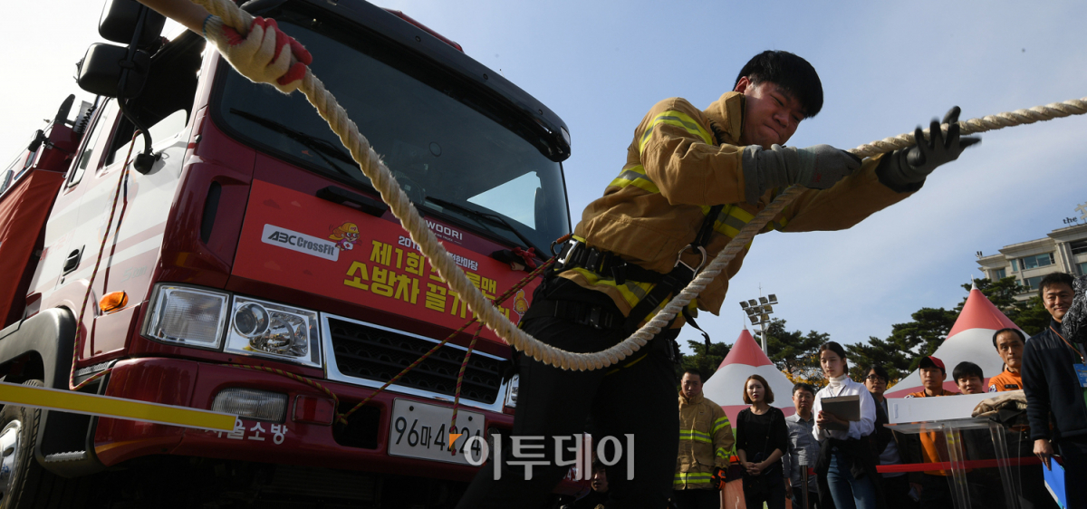 '2018 서울안전한마당'이 개막한 25일 오후 서울 여의도 여의도공원에서 행사의 일환으로 열린 '제1회 스트롱맨 소방차 끌기 대회'에 참가한 서울시 소방공무원들이 소방펌프차(8t)를 맨몸으로 끌며 선의의 경쟁을 벌이고 있다. 화재·교통·생활안전 등 5개 유형 80여 개의 시민 참여형 안전체험 프로그램이 운영되는 이번 행사는 오는 27일까지 여의도공원 일원에서 이어진다. 오승현 기자 story@