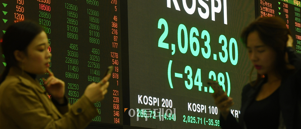 코스피(KOSPI)가 연일 연중 최저점을 경신하는 등 좀처럼 반등의 기회를 잡지 못한 채 추락하고 있다. 코스피 지수가 장중 2033.81까지 기록하며 지난해 1월3일(2028.47) 이후 최저 수준으로 내려간 25일 오후 서울 여의도 한국거래소 전광판에 전 거래일보다 34.28포인트(1.63%) 하락한 이 날 코스피 종가(2063.30)가 보이고 있다. 오승현 기자 story@