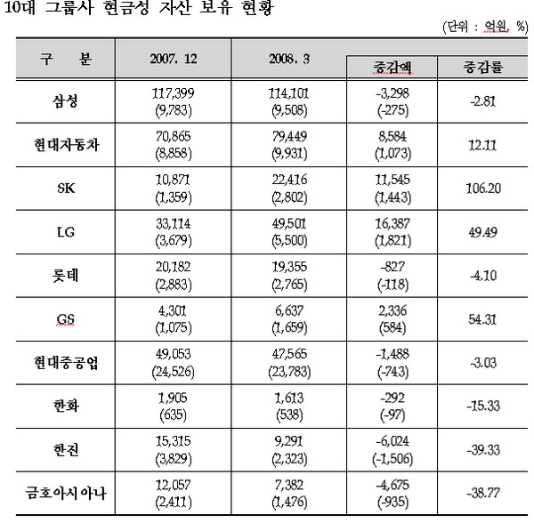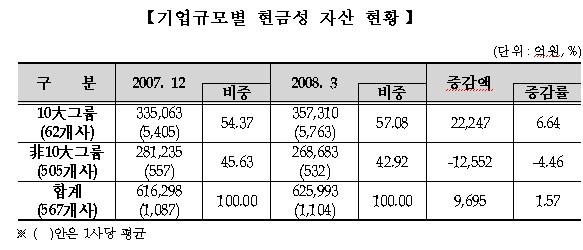 거래소 관계자는 "10대그룹사의 1사평균 현금성 자산은 5763억원, 비10대그룹사는 532억원으로 10대그룹이 비10대그룹에 비해 1사평균 9.83배의 현금성자산을 보유했으며, 이는 2007년말의 8.70배에 비해 그 격차가 더 벌어진 것"이라고 설명했다.