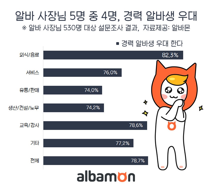 아르바이트 대표포털 알바몬이 알바 사장님 530명을 대상으로 '경력직 알바 우대 현황' 설문조사를 실시하고 그 결과를 29일 발표했다.