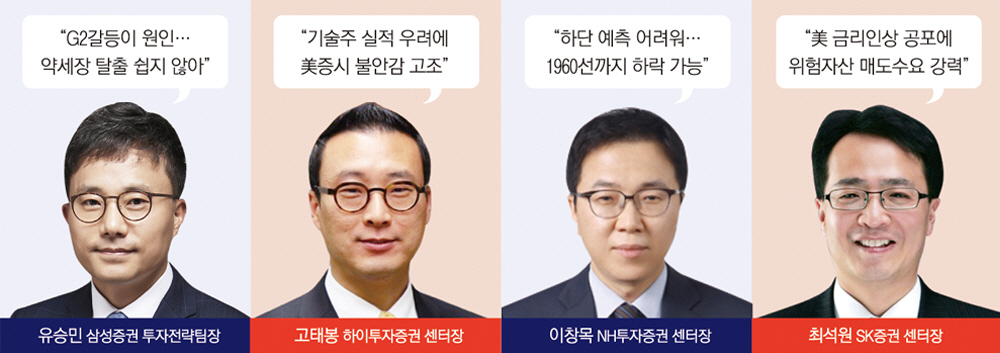 ◇약세장 지속 전망… “투자자들 신중해야” = 문제는 이 같은 불확실성이 당분간 이어질 가능성이 크다는 점이다. 이창목 NH투자증권 리서치센터장은 “밸류에이션 지지선의 의미가 퇴색되고 있어 하단을 속단하기 어렵다”면서 “2008년 10월 금융위기 당시 저점인 892선의 밸류에이션을 현재에 적용해보면 1960선까지 떨어질 수 있다”고 분석했다.