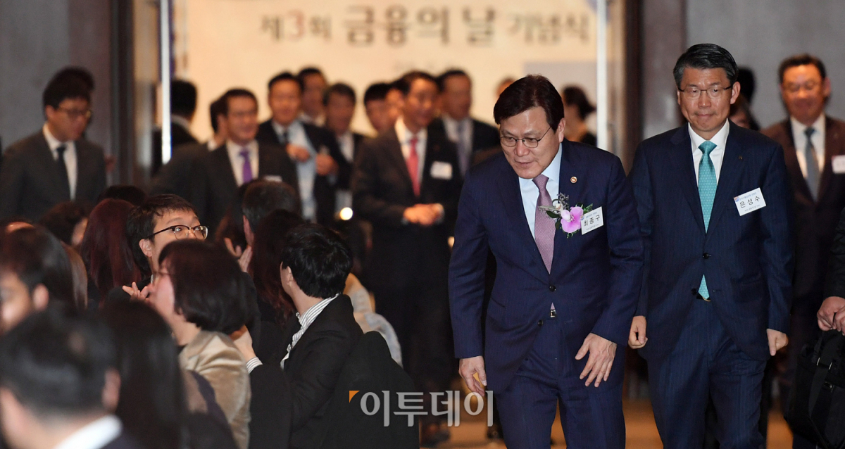 '제3회 금융의 날 기념식'이 열린 30일 오전 서울 여의도 63컨벤션에서 최종구 금융위원장과 은성수(오른쪽) 한국수출입은행장이 행사장에 입장하고 있다. 이날 기념식에서 저축과 금융혁신, 서민금융 부문 유공자들에게 표창이 수여됐다. 오승현 기자 story@