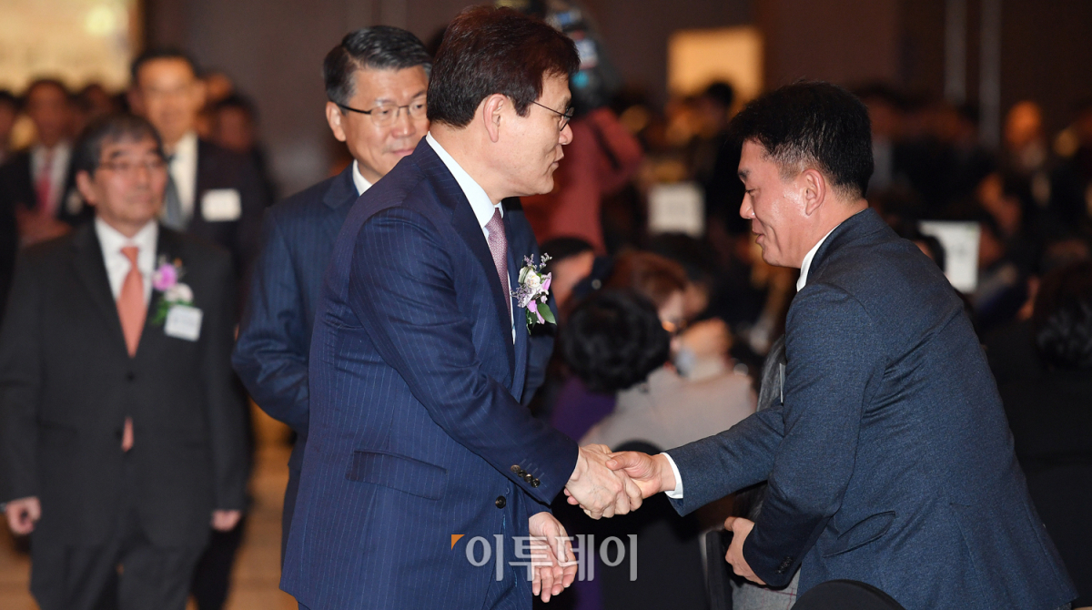 '제3회 금융의 날 기념식'이 열린 30일 오전 서울 여의도 63컨벤션에서 최종구 금융위원장이 참석자들과 인사를 나누고 있다. 이날 기념식에서 저축과 금융혁신, 서민금융 부문 유공자들에게 표창이 수여됐다. 오승현 기자 story@