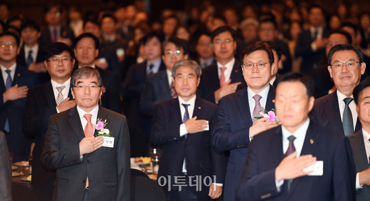 '제3회 금융의 날 기념식'이 열린 30일 오전 서울 여의도 63컨벤션에서 최종구(오른쪽) 금융위원장과 윤석헌 금융감독원장을 비롯한 내빈들이 행사에 앞서 국민의례를 하고 있다. 이날 기념식에서 저축과 금융혁신, 서민금융 부문 유공자들에게 표창이 수여됐다. 오승현 기자 story@