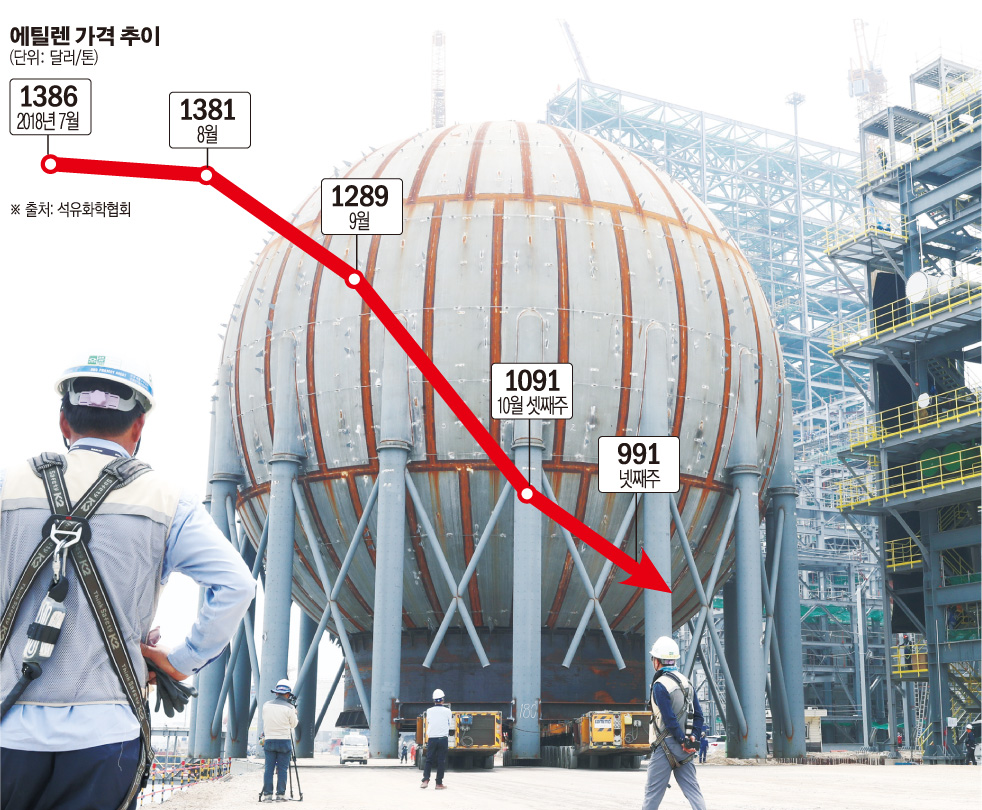 올해 7월에는 톤당 1386달러(약 158만 원)까지 상승했다. 에틸렌 가격이 갑작스럽게 하락하게 된 배경에는 미중 무역 분쟁이 있다. 중국은 우리나라로부터 에틸렌과 같은 원료를 수입해 가공품을 만들어 전 세계에 수출하고 있다. 무역분쟁으로 인해 중국의 에틸렌 수요는 줄어들었고, 가격에도 영향을 미친 것이다.