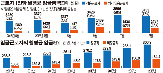 상용직과 임시직만큼 정규직과 비정규직의 임금 격차도 심각했다. 이날 통계청이 발표한 ‘2018년 8월 경제활동인구조사 근로형태별 부가조사 결과’에 따르면 올해 정규직 월평균 임금은 300만9000원으로 전년보다 15만8000원(5.5%), 비정규직은 164만4000원으로 7만5000원(4.8%) 증가했다. 비정규직의 월급이 정규직의 절반 수준에 그친다는 얘기다.