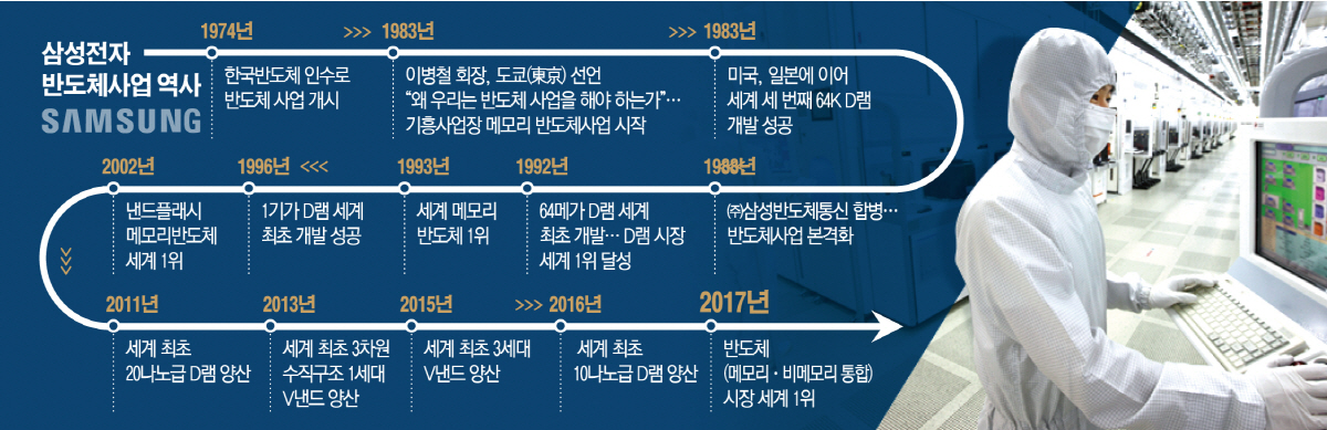 이병철 선대 회장은 1986년 전 세계 D램 시장이 최악의 불황기를 맞은 상황에서 3번째 생산라인 착공을 서두르라고 지시했다. 글로벌 업계가 의아해했지만 3년 뒤인 1988년 D램 시장이 대호황기를 맞으며 그의 사업적 선견지명은 맞아떨어졌다. 이건희 회장은 수시로 일본을 직접 방문, 반도체 기술자들과 만나 노하우를 전수받으며 기술 확보에 주력했다.