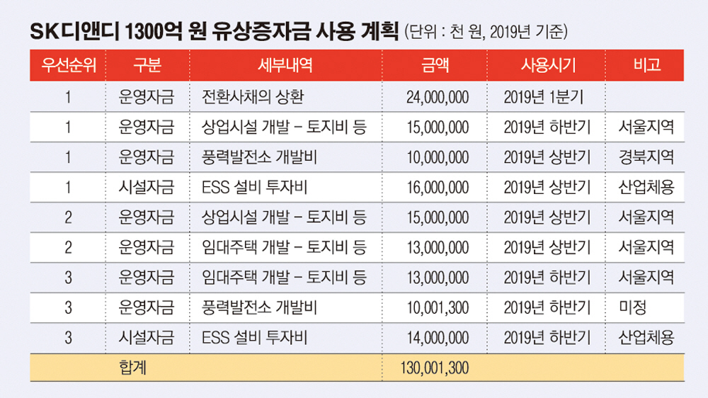 SK디앤디가 신규 프로젝트 개발비를 주주 쌈짓돈으로 충당한다. SK디앤디는 1300억 원 규모 주주배정 유상증자(신주상장예정일 2019년 01월 09일)를 통해 신규 자금 조달을 진행하고 있다.