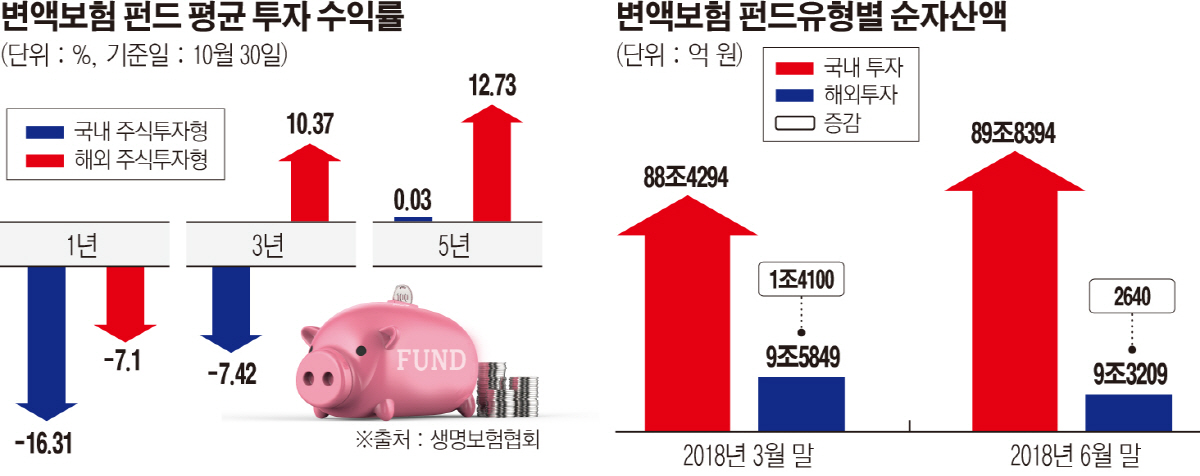 아울러 전 세계 주식의 동반 하락으로 해외 주식 투자형 변액보험 펀드의 1년 수익률 역시 평균 ‘-7.1%’를 기록했다. 다만 3년 평균 수익률은 10.37%로 수익을 내고 있어 아직은 여유가 있다. 올 2분기 기준 변액보험 국내 투자 펀드 순자산액은 총 88조4294억 원으로 지난 분기보다 1조4100억 원 감소했다. 반면 같은 기간 해외 투자 펀드 순자산액은 9조5800억 원으로 전 분기보다 2600억 원 증가했다. 변액보험 총 펀드 투자액은 101조5000억 원으로 집계됐다.