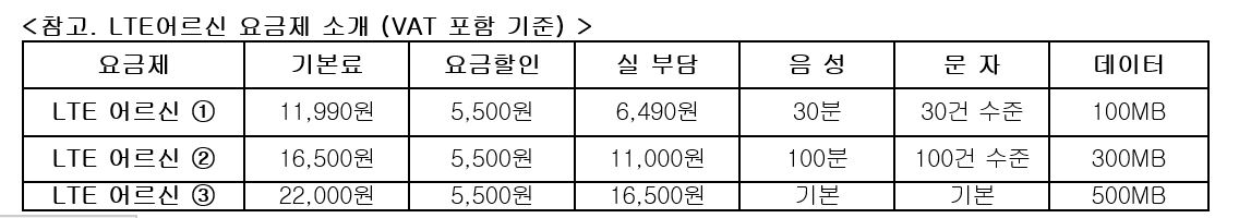 월 기본료는 △1만1990원(음성 30분, 문자 30건 수준, 데이터 100MB) △1만6500원(음성 100분, 문자 100건 수준, 데이터 300MB) △2만2000원(음성·문자 기본 제공, 데이터 500MB)이다.