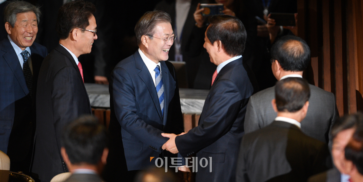 문재인 대통령이 1일 오전 서울 여의도 국회의사당 본회의장에서 2019년도 예산안 국회 본회의 상정에 따른 시정연설을 마친 뒤 퇴장하며 김성태 자유한국당 원내대표를 비롯한 야당 의원들과 인사를 나누고 있다. 오승현 기자 story@
