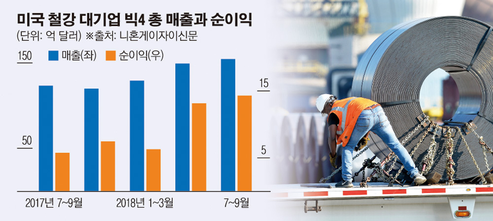 US스틸과 누코어, 스틸다이내믹스와 AK스틸 등 미국 철강 대기업 4곳의 총 순이익이 지난 3분기에 10년 만의 최대치를 기록했다고 2일(현지시간) 일본 니혼게이자이신문이 보도했다. 이들 철강 빅4의 3분기 총 순익은 14억 달러(약 1조5732억 원)로 전년 동기 대비 2.5배 급증했다.