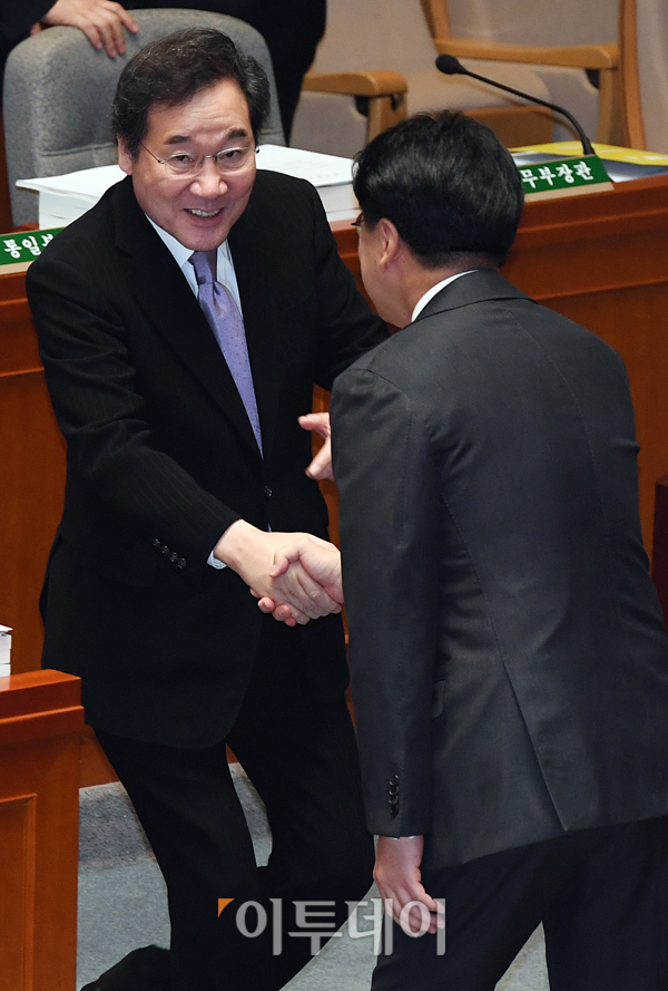 [포토] 야당 간사와 반갑게 인사하는 이낙연 국무총리