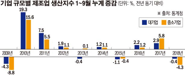 주로 자동차부품업, 기타금속가공업, 플라스틱제조업 등에서 감소 폭이 컸다. 주력산업인 조선업과 자동차업 불황이 직접적인 원인이다. 이들 산업에는 전속계약 형태로 특정 기업에만 부품을 납품하거나, 대기업 생산시설 내에서 일부 공정만 맡는 하청·협력업체 비율이 높다. 따라서 원청 대기업의 불황은 관련 중소기업 불황으로 이어질 수밖에 없다는 게 통계청의 설명이다. 반면 대기업 제조업 생산은 1~9월 누계로 전년 동기 대비 0.4% 감소에 그쳤다.
