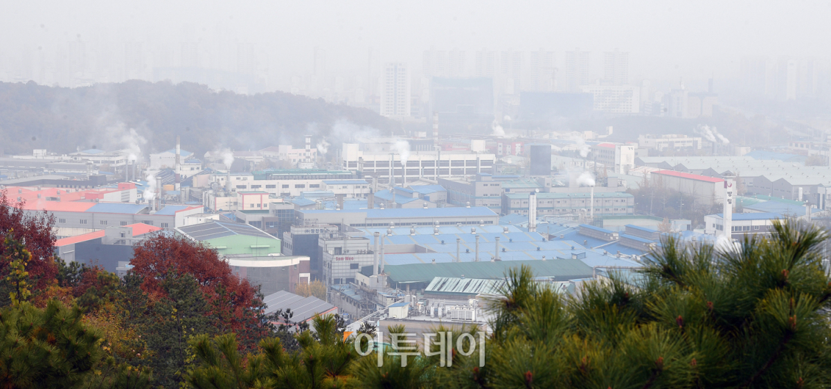 한반도 주변 대기 정체로 국내에서 발생된 오염물질이 쌓인 데에 중국발 스모그가 가세하면서 대기 질이 더욱 악화됐다. 서울에 올가을 첫 초미세먼지 주의보가 발령된 6일 오후 경기도 안산시 안산스마트허브 전망대에서 바라본 반월국가산업단지가 뿌옇게 보이고 있다. 기상청은 "오는 8일 전국에 비가 내리면서 초미세먼지가 해소될 것"이라 내다봤다. 오승현 기자 story@