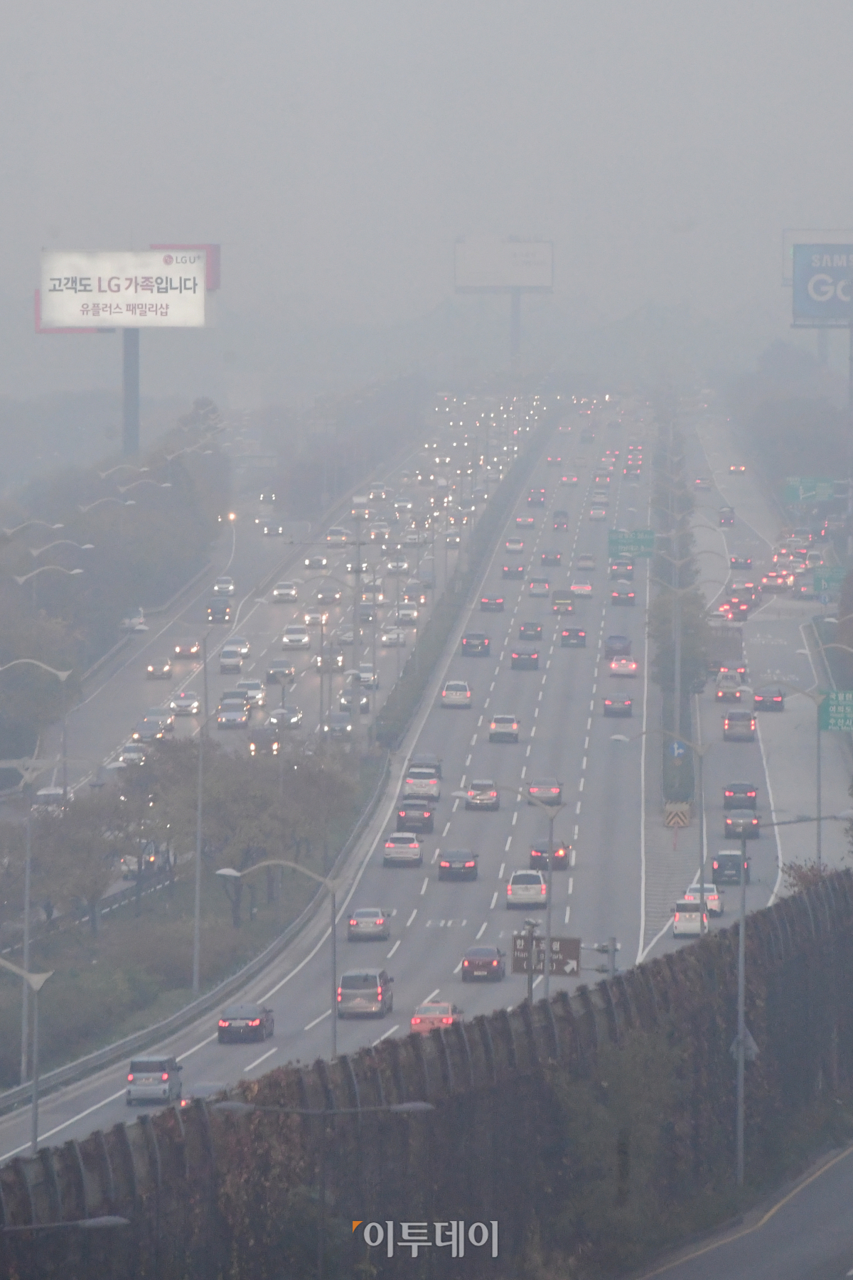 올해 가을 처음으로 서울·인천·경기 등에 미세먼지 비상저감조치가 발령된 6일 서울 올림픽대로에서 운전자들이 차량에 전조등을 켜고 서행하고 있다. 비상저감조치가 발령되면 내일 오전 6시부터 9시까지 공공기관 차량 2부제가 시행되며 행정·공공기관은 조업시간을 단축한다. 고이란 기자 photoeran@