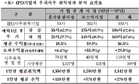 29일 한국증권금융(사장 이두형)에 따르면 2002년부터 2007년의 기간 동안 실시된 355개 회사의 IPO에서 종업원이 취득한 우리사주 주가는 의무예탁기간 1년이 경과한 시점에서 평균 36.3% 상승했다.
