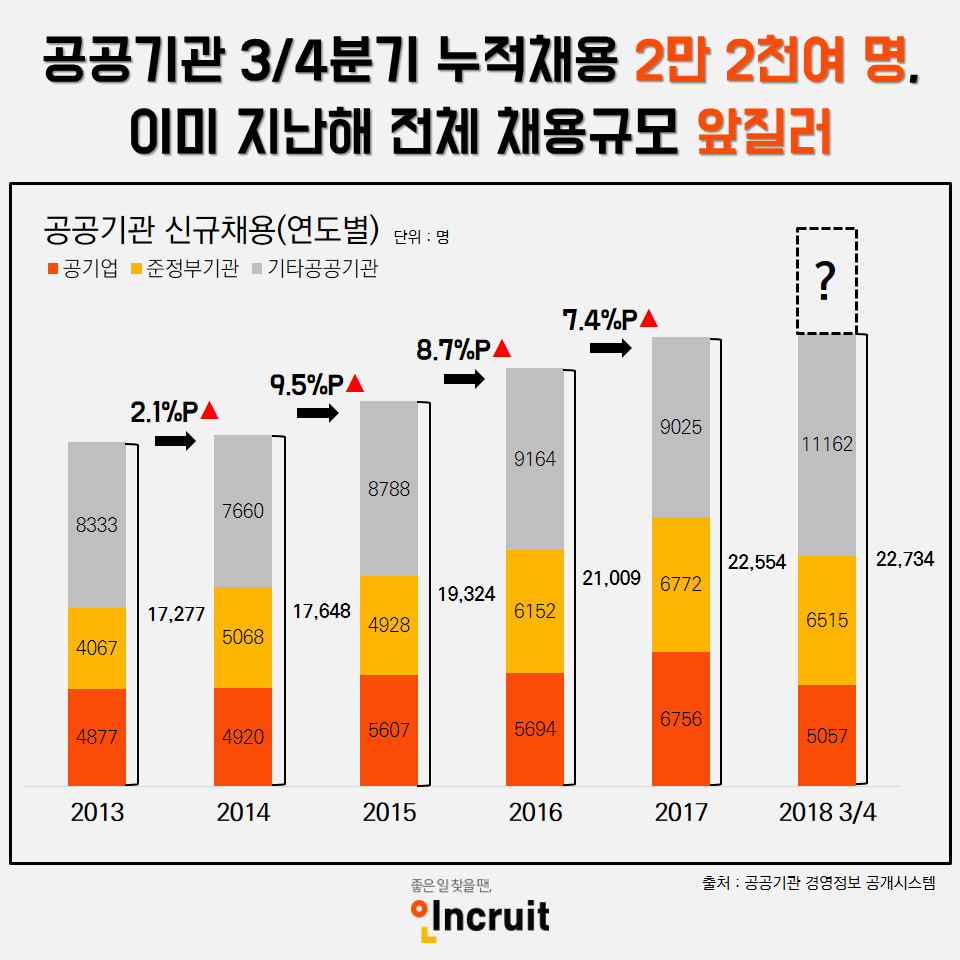 올 초 정부는 2018 공공기관 신규채용 규모를 지난해 말 예정한 2만3000명에서 5000명을 더 늘린 2만8000명 이상으로 확대한다고 발표한 바 있다. 이미 3분기 누적 채용규모는 전체 예상 채용규모의 80% 수준에 도달했다.