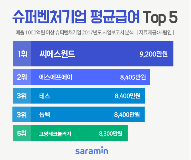직원 1인당 평균 급여(연봉ㆍ수당ㆍ성과급 등 포함 실지급액 기준, 천단위 이하 절사)가 높은 상위 10개 기업으로는 씨에스윈드가 9200만원으로 1위를 차지했다.
