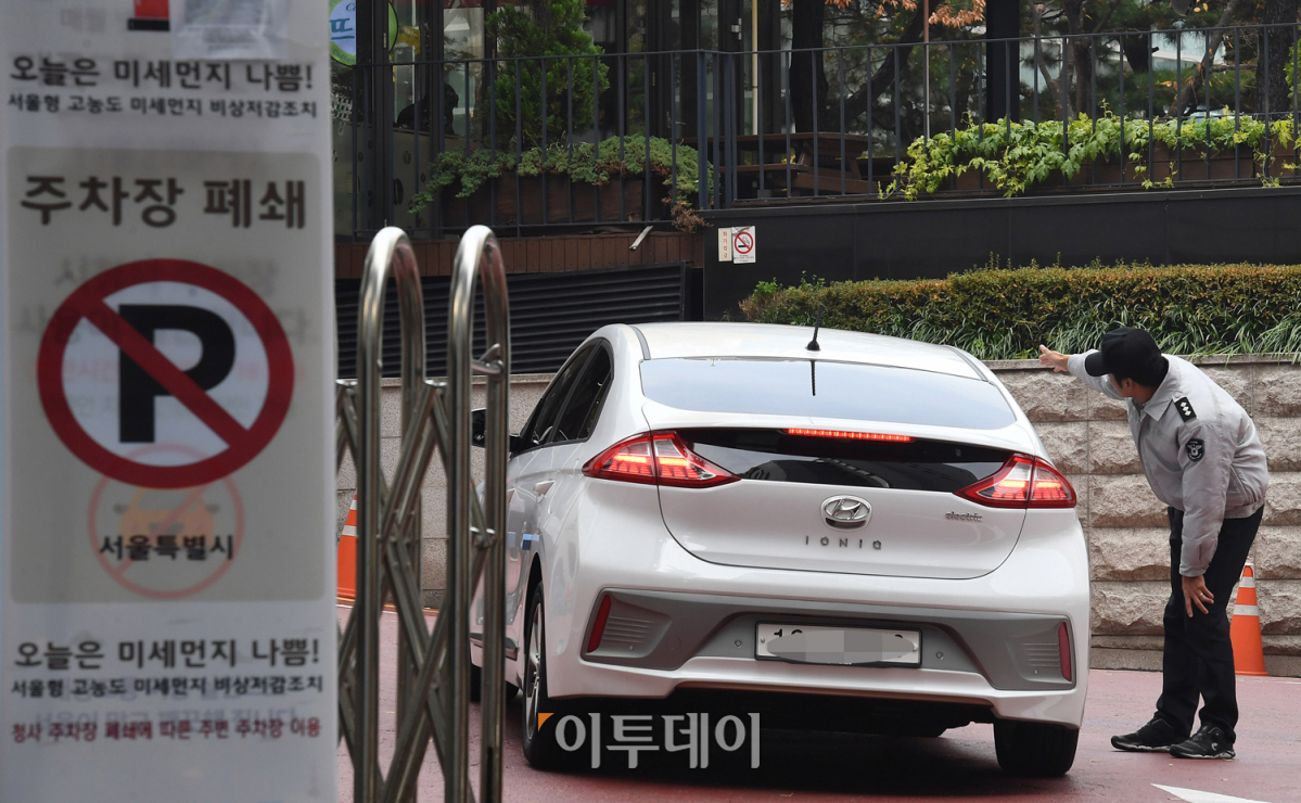'서울형 미세먼지 비상저감조치'가 발령된 7일 오전 서울시청 서소문별관 주차장이 폐쇄돼 있다. 서울시는 이번 조치로 공공기관 주차장 456개소를 전면 폐쇄하고 3만3000여 관용차의 운행을 중단했다. 오승현 기자 story@