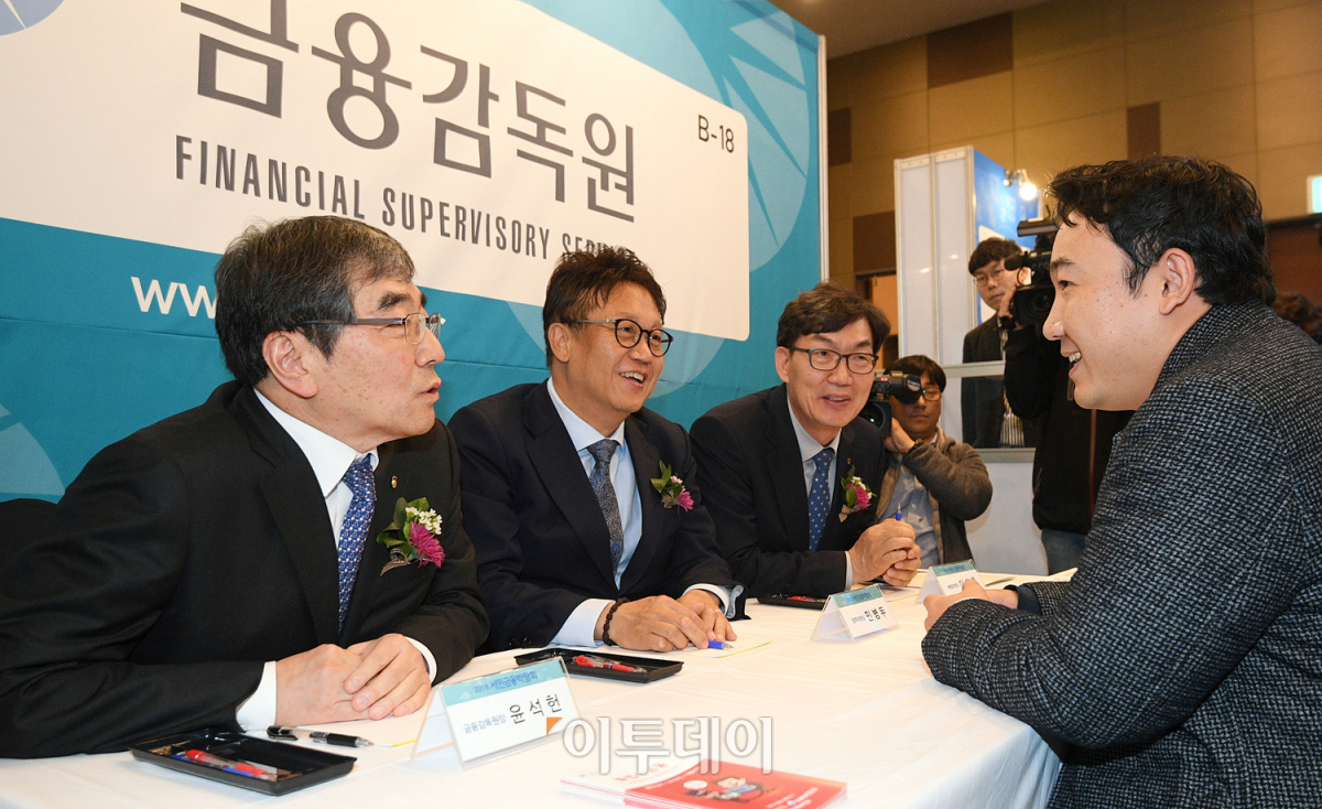 '2018 서민금융 박람회'가 열린 8일 오전 서울 영등포구 그랜드컨벤션센터에서 윤석헌 금융감독원장과 민병두 국회 정무위원회 위원장, 이대훈 NH농협은행장이 개별 상담을 통해 서민금융의 애로사항을 청취하고 있다. 이번 박람회에서는 새희망홀씨(은행권)와 햇살론(저축은행 및 상호금융) 등 정책서민금융대출, 신용회복위원회의 채무조정, 주거복지 상담이 이뤄졌다. 오승현 기자 story@