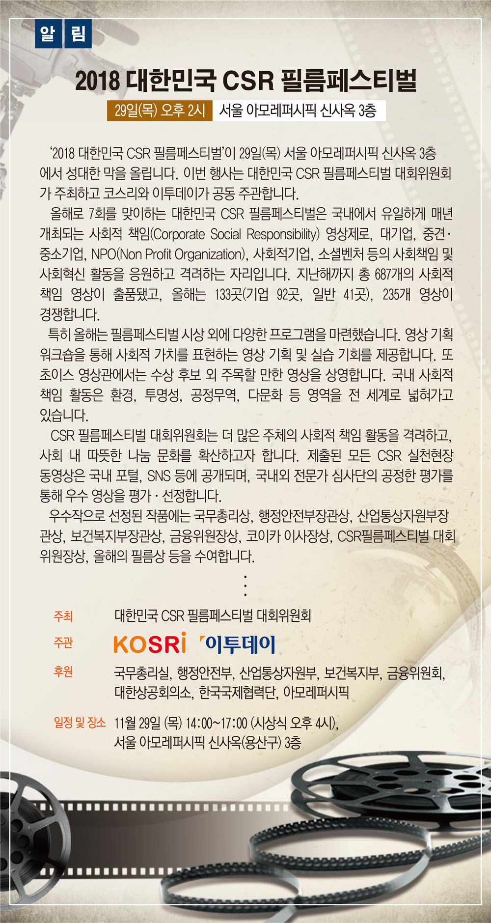 ‘2018 대한민국 CSR 필름페스티벌’이 29일(목) 서울 아모레퍼시픽 신사옥 3층에서 성대한 막을 올립니다. 이번 행사는 대한민국 CSR 필름페스티벌 대회위원회가 주최하고 코스리와 이투데이가 공동 주관합니다.