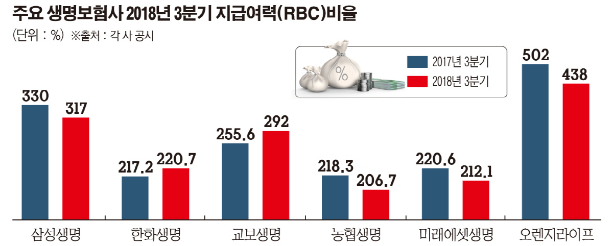 15일 각 사 3분기 영업 공시에 따르면, 생명보험사 상위 5개사의 RBC 비율은 지난해와 비교하면 교보생명을 제외하곤 지난해 수준을 유지하거나 오히려 감소한 것으로 나타났다. 삼성생명은 3분기 RBC 비율 317%를 기록해 지난해 동기 330%보다 13%포인트(P) 줄어들었다.