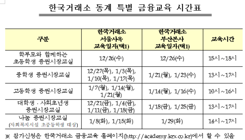 한국거래소는 겨울방학을 맞이해 어린이, 청소년 및 대학생을 대상으로 자본시장 및 경제전반에 대한 이해를 높이기 위해 '동계 특별 금융교육'을 실시한다고 19일 밝혔다.