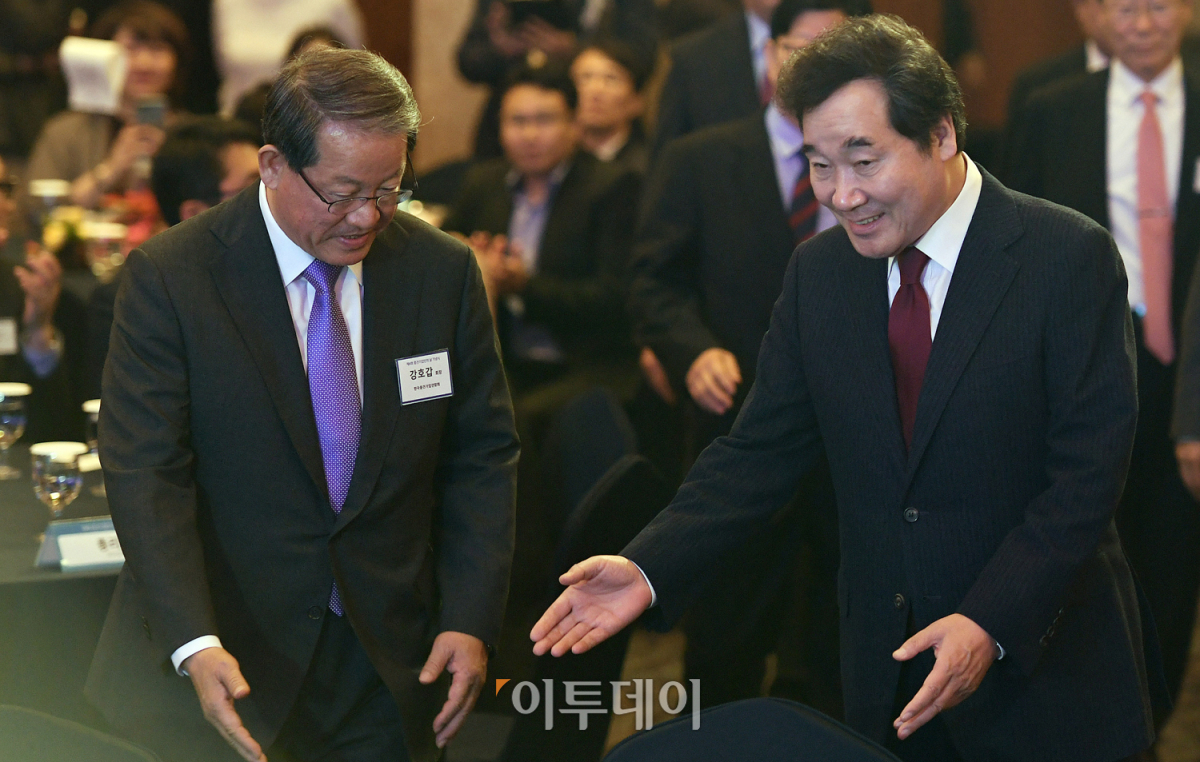 '제4회 중견기업인의 날 기념식'이 열린 19일 오후 서울 중구 롯데호텔에서 이낙연 국무총리가 강호갑(왼쪽) 한국중견기업연합회 회장 등과 행사장에 입장하고 있다. 올해 신설된 '중견기업 주간'의 첫 행사로 열린 이날 기념식에서 기술혁신과 해외시장 개척으로 우리 경제의 성장과 고용 창출을 선도한 우수 중견기업인 총 32명에게 정부 포상이 수여됐다. 오승현 기자 story@