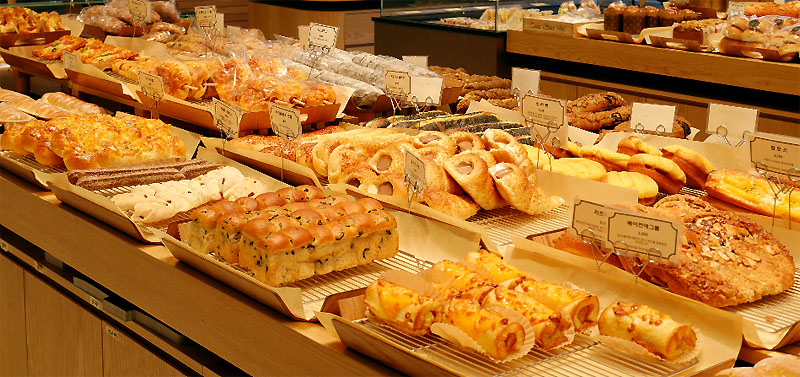 피칸엘리게이터, 모카 크림빵, 흑당케익, 튀김소보로, 바삭바삭고로케, 팥 도넛, 투나 샌드위치, 치즈 바게트, 화이트롤, 만득이 버거든 다양한 빵의 집합체처럼 보인다.