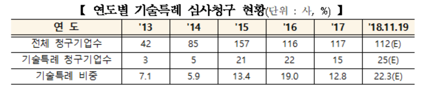 기술특례 청구기업 수도 25개 사로 역대 최대치가 예상된다. 전체 청구기업의 22%에 달해 기술특례제도가 코스닥 진입의 주요 창구로 정착하고 있다고 평가했다.