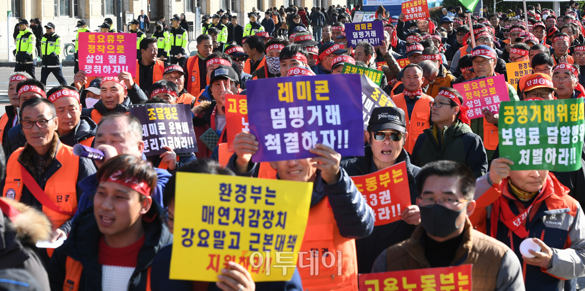 전국레미콘운송총연합회 주최 '전국레미콘운송종사자 생존권사수를 위한 총력투쟁 결의대회'가 열린 20일 오후 서울 종로구 세종대로에서 참가자들이 특수형태근로자들의 노동3권 보장, 국제노동기구(ILO) 핵심협약 비준 등을 촉구하며 청와대 방면으로 행진하고 있다. 오승현 기자 story@
