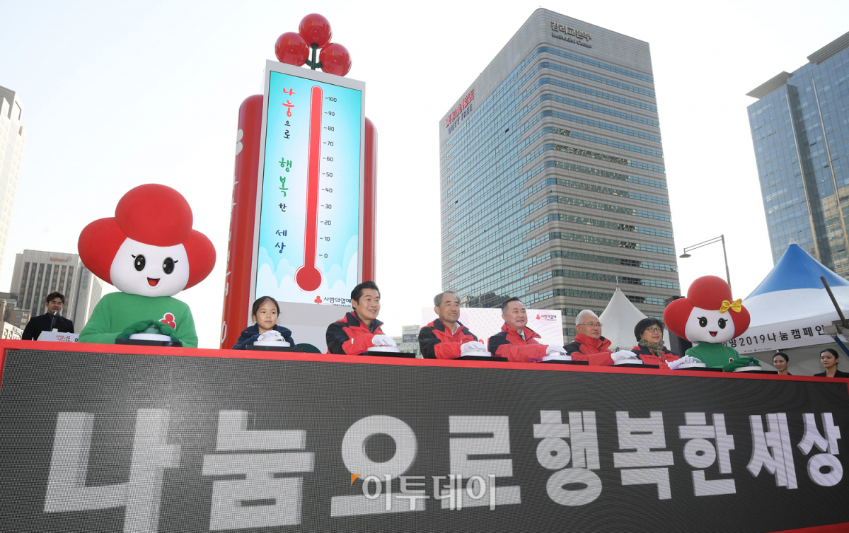 사회복지공동모금회가 전국 각지에 마련된 '사랑의 온도탑' 제막을 시작으로 '희망 2019 나눔캠페인'에 돌입했다. '사랑의 온도탑 제막식'이 열린 20일 오후 서울 종로구 광화문광장에서 예종석 사회복지공동모금회장, 윤영석 서울시 정부1부시장, 홍보대사 이연복 요리사 등 참석자들이 캠페인 시작을 알리는 퍼포먼스를 하고 있다. 공동모금회는 내년 1월 31일까지 지난해 모금액인 4051억 원보다 1.3% 많은 4105억 원 모금을 목표로 캠페인을 진행한다. 오승현 기자 story@