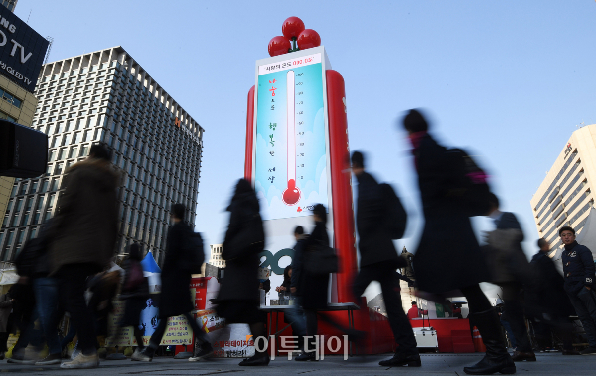 사회복지공동모금회가 전국 각지에 마련된 '사랑의 온도탑' 제막을 시작으로 '희망 2019 나눔캠페인'에 돌입했다. '희망 2019 나눔캠페인'이 시작된 20일 오후 서울 종로구 광화문광장에 마련된 사랑의 온도탑이 0℃를 가리키고 있다. 공동모금회는 내년 1월 31일까지 지난해 모금액인 4051억 원보다 1.3% 많은 4105억 원 모금을 목표로 캠페인을 진행한다. 오승현 기자 story@