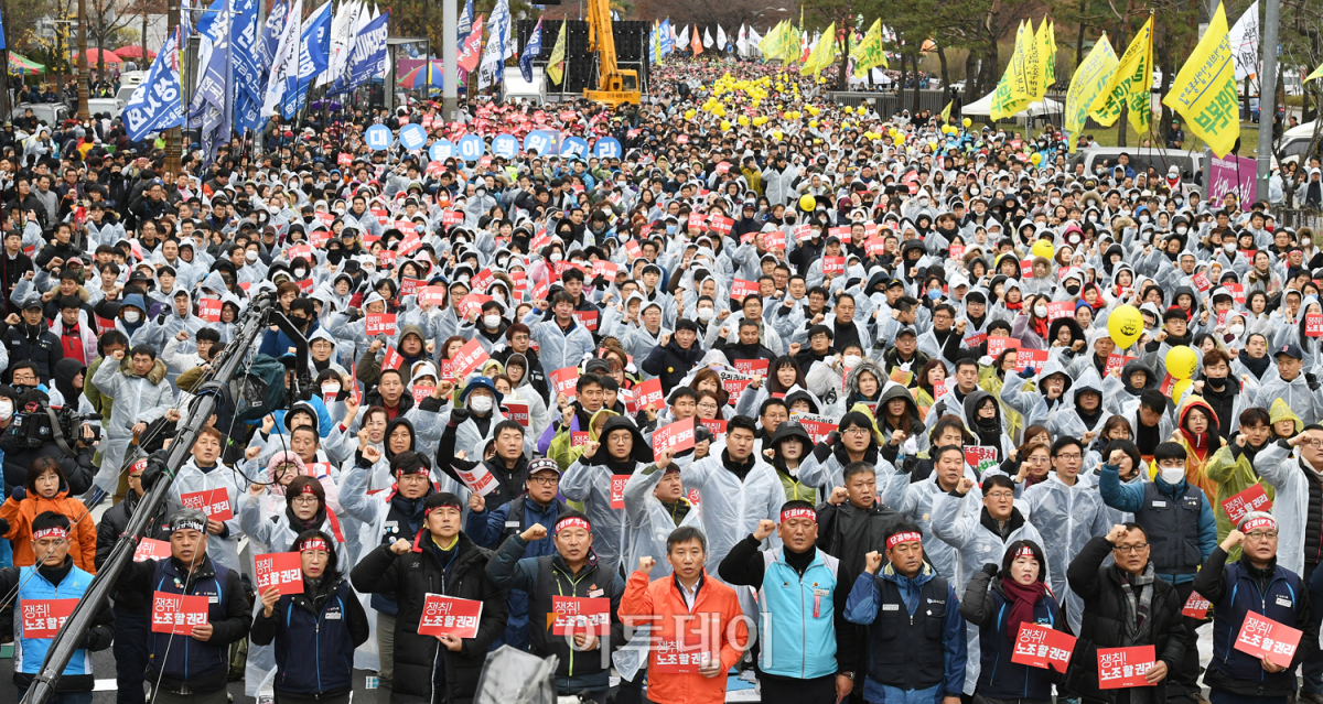전국민주노동조합총연맹(민주노총)이 전국 14개 지역에서 동시다발 총파업 대회를 개최했다. '적폐청산-노조 할 권리-사회대개혁을 위한 민주노총 총파업 대회'가 열린 21일 오후 서울 여의도 국회 앞에서 집회 참가자들이 탄력 근로 기간 확대 중단과 노조법 개정, 비정규직 정규직 전환 등을 요구하고 있다. 오승현 기자 story@